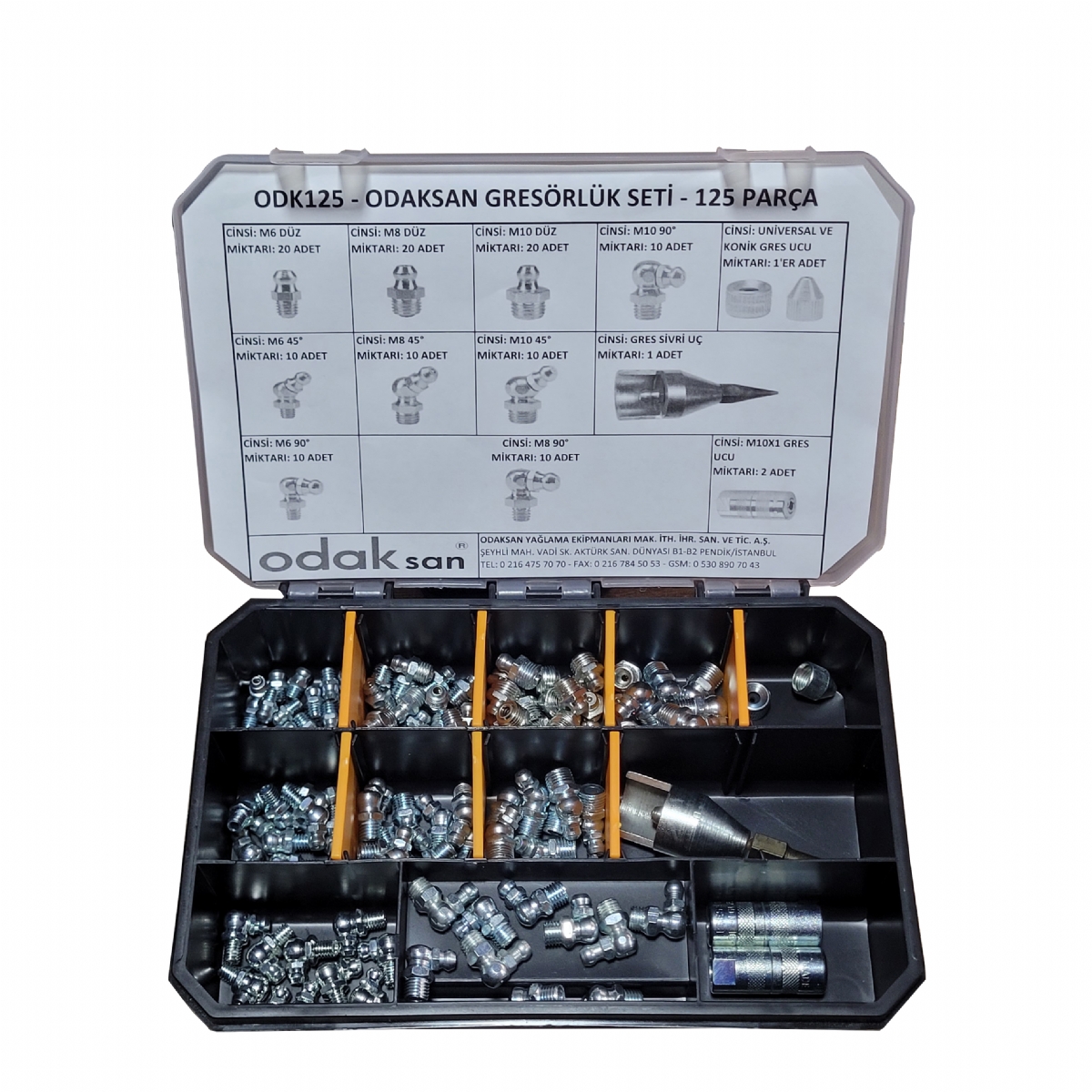 Endüstriyel bakım ve servis ihtiyaçları için özel olarak hazırlanan Odaksan Kutulu Gresörlük Seti 139 Parça, farklı ölçü ve tiplerde gresörlük (yağlama nipeli) seçenekleriyle tüm yağlama işlemlerinizde maksimum esneklik sağlar. Kompakt ve dayanıklı kutusu sayesinde sahada, atölyede ve servis araçlarında kolay kullanım sunar.